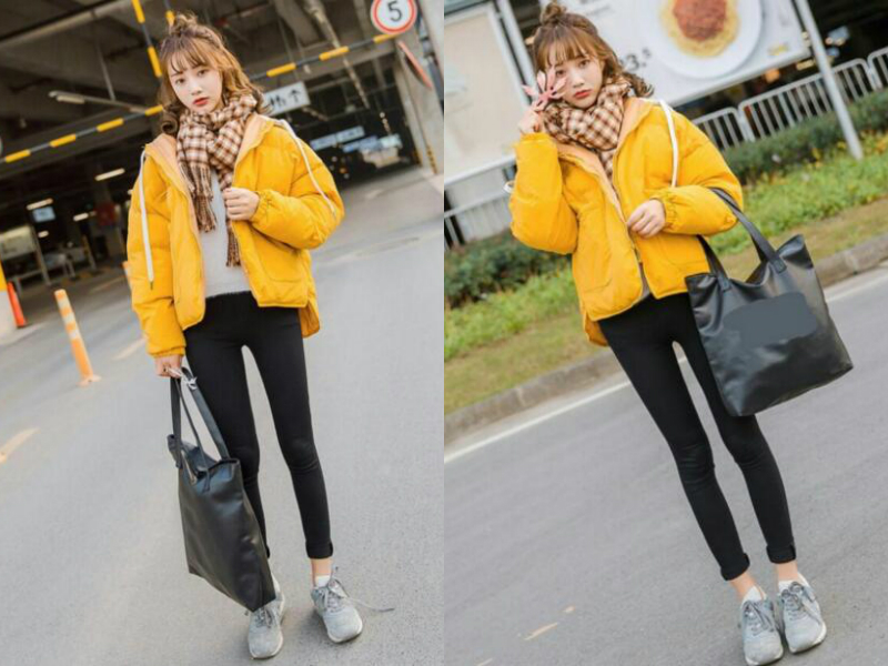明亮的柠檬黄色不管何时都很吸睛,以一件黄色的短款棉服作为外套,保暖又显得妹子娇小可爱,下身穿一条黑色打底裤,显瘦又显腿长,再戴上一条格子元素的围巾,随意的缠绕几圈像打个结一样,更衬托得妹子脸蛋娇俏惹人爱。