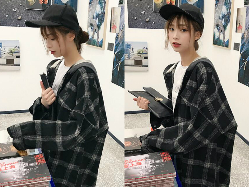 黑白格子的连帽衫宽松的版型,蝙蝠袖的设计,穿着休闲随性,搭配一顶黑色鸭舌帽,为清纯的女生增添了不少潮流范,还很显青春年轻,这样的穿搭出街秒变街拍达人。