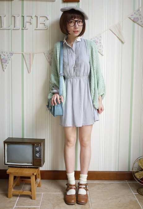 冰淇淋色系的复古造型,略显小清新风格,但是搭配这顶个性的帽子,和复古的学生鞋,复古的味道就出来了,高腰的裙子还能拉长身线,特别显高,带上一副大大的眼镜,略显小可爱。