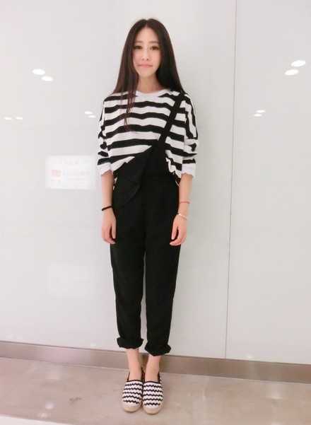 宽松的横纹T作为打底,黑色的背带裤一边随意地掉下来,裤脚做了折边造型,再搭配一双波浪纹的小船鞋,这身完美的搭配,让你立刻年轻十岁,一点都不假,小孩子穿背带裤不也是这样的吗?但是融入了横纹和波浪纹的元素,使之时尚,一点都不幼稚,还有着很好的减龄效果。