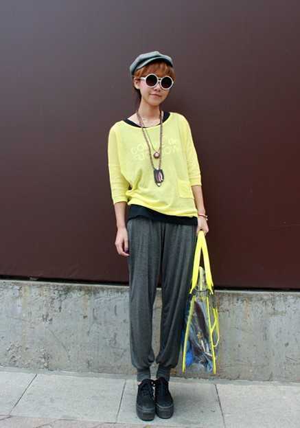 垂感十足的小脚哈伦裤,适当地遮挡住了腿上多余的肉肉,一件明黄色的罩衫,突出重点,让你瞩目万分,内搭一件黑色的小背心,不仅谐和,而且胸前若隐若现的字母更是神秘感十足。