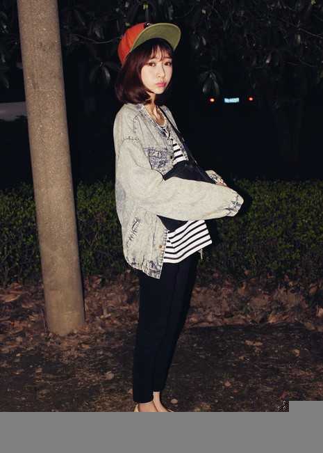 超旧的颜色处理,无领的设计,宽松的版型,把男朋友风展现得淋漓尽致,搭配一条小脚裤,平底单鞋,还有棒球帽,展现了女生酷酷的一面哦。
