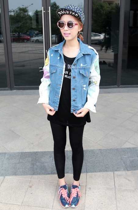 可爱又帅气的牛仔外套,可爱的涂鸦,展现了女生可爱俏皮的一面,搭配NB鞋和帽子,同样能给人帅气的感觉。