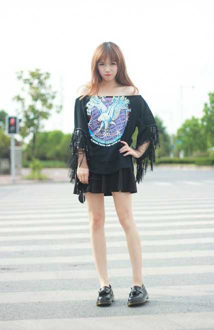 这身搭配十分的日本FEEL哦,宽松的一字肩流苏上衣,十分时尚帅气,搭配一条黑色的百褶短裙,简直完美,黑色的造型设计使得上衣的图案十分显眼。
