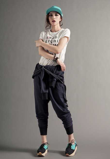 简简单单的一件字母T恤,搭配一条两穿的哈伦运动裤,休闲之余不失街头味道,一双拼色的跑鞋更是把运动街头风发挥得淋漓尽致。