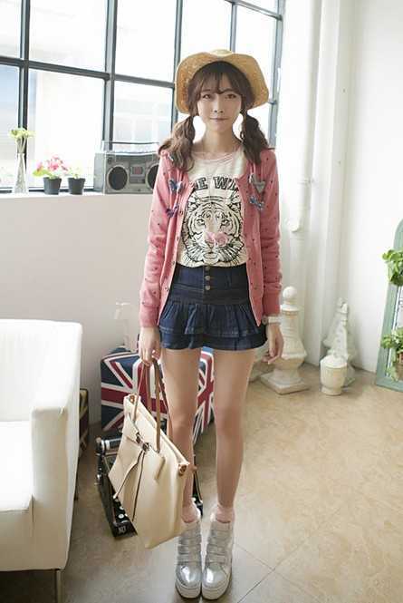 粉红色的蝴蝶结外套,搭配荷叶边小皱褶牛仔裙,高腰的造型设计和内增高的鞋子让人看起来十分高挑,发型的设计加上编织帽子,更是甜美十足。
