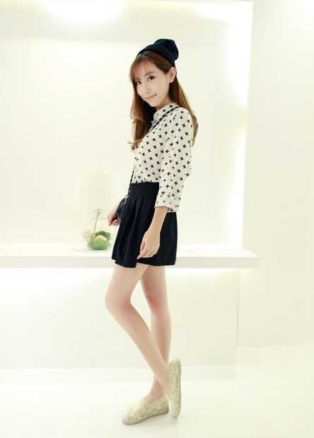 小花纹铺满了白色的衬衫,七分袖的设计十分俏皮可爱,搭配高腰的黑色百褶裙,时尚大气,镂空的蕾丝单鞋,和可爱的小帽子更加展现了甜美风。