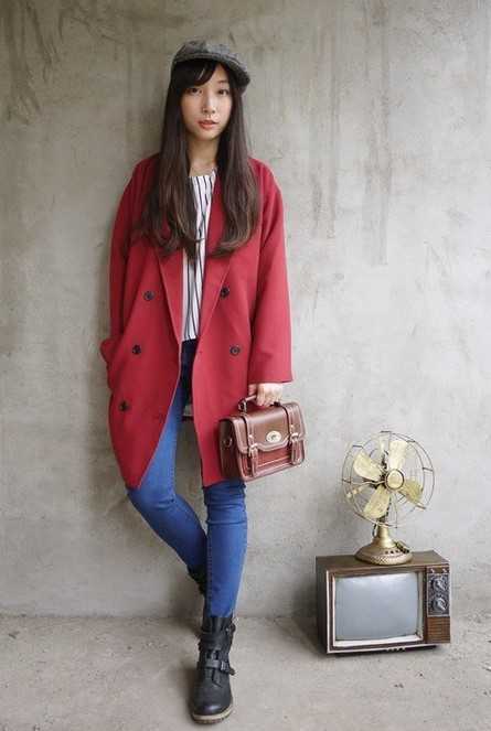 长款的宽松款式西装,在今年秋季很流行的一个款式哦,不怎么鲜艳的红色特别好看,搭配蓝色牛仔裤和马丁靴立显复古感觉。