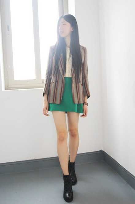 这款竖纹的小西装很特别哦,复古又时尚的感觉,搭配一条高腰拼接裙子,把身材拉高,搭配一双黑色的小短靴,秋天特别有型的搭配之一哦。