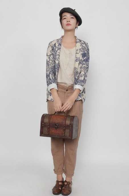 复古风青花纹小西装,随意的版型,线条轮廓没有很硬朗的感觉,搭配做旧色的T和裤子,更是复古风展现得淋漓尽致啊,配饰也如此好看。