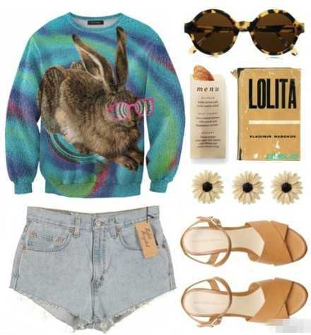 宇宙般的幻变中,一只带着眼镜的野兔子快要跑出来的感觉,原宿风十分强烈的一款动物卫衣,十分特别,搭配一条超短裤,和一双浅棕色的高跟鞋,时尚凸显,展现了女生的俏皮可爱。
