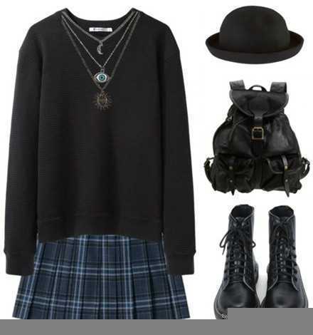深海蓝色的格子百褶裙能够很好地展现出女性的独立知性的感觉,搭配一件黑色的针织卫衣,十分简约,搭配一双中帮的马丁靴,帅气的学院风顿现,相信不少学院少女会喜欢哦。