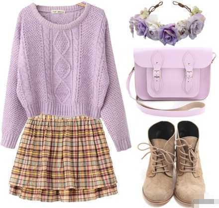 田园风十足的不规则百褶裙,搭配梦幻般的芋紫色短款毛衣,淑女风顿现,搭配一双圆头的小短靴和紫色的复古包,展现了一个学院里的乖乖女形象。