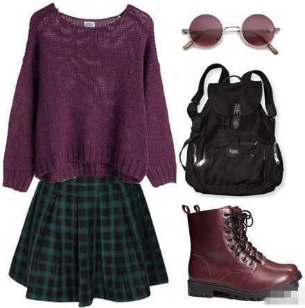 墨绿色的格子纹百褶裙搭配神秘紫毛衣,撞色设计形成了明显的立体效果,搭配一双温和的红棕色马丁靴,中和了强烈的视觉冲击,这种搭配很适合白皮肤的女生哦。