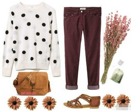 白色打底的黑色波点针织衫,穿着舒适,搭配一条九分的红棕色休闲裤,别有一番风味,一双简单的罗马鞋,更能彰显出女性的知性优雅。