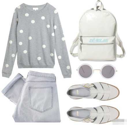 浅灰色的波点毛衣,搭配一条浅浅紫色的暗竖纹休闲裤,裤脚翻边处理,十分时尚简单,搭配一双白色的罗马鞋,超级好看的哦,背上一个白色的背包,最低调的帅气非你莫属。