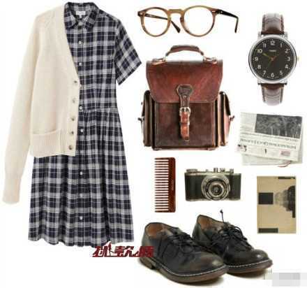 八十年代的短袖格子及膝裙,复古味道浓郁,搭配一件白色的针织开衫,展现女性的知性优雅,搭配一双做旧的黑色小皮鞋,和做旧款的复古小箱包,文艺的气息扑面而来。