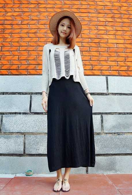 一条经典的黑色长裙,相信很多MM都拥有,包括小编。搭配一件不简单的前襟破洞针织衫,十分时尚,而且短款的设计更显身高腿长,搭配小草帽和一双简单的罗马风凉鞋,展现了秋季微微的波西米亚风。