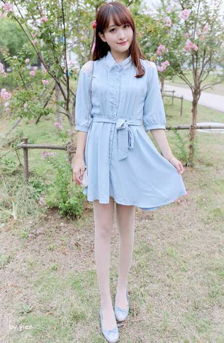 湖蓝色的超淑女的一款连衣裙,五分袖的设计,十分干净利落,胸前的皱褶也十分整齐不紊,高腰的设计更显腿长,腰部的装饰也十分自然,搭配一条白色的丝袜,小清新风立显,加上一双浅蓝色的蝴蝶结平底单鞋,更是甜美风十足。