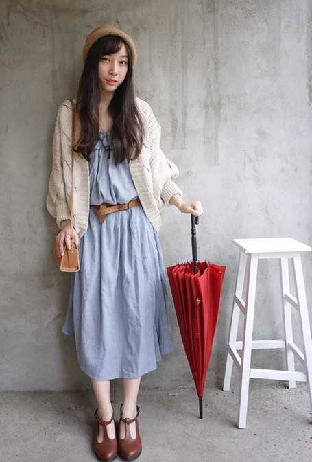 湖蓝色的文艺风长裙,展现了森林系女生的安静与气质,腰间的皮带修饰使整体的造型变得立体,搭配一双复古的巴洛克鞋子,更是完美,在秋季,一件白色的蝙蝠袖针织外套十分实用,既保暖又好看。