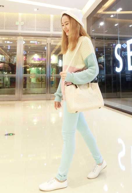 冰淇淋色的针织衫十分符合安静的女生,尽情地彰显了女生简约朴素的个性,搭配一条同样冰淇淋蓝的紧身休闲裤,休闲又时尚,搭配白色的帽子和鞋子,更是将简约的韩系风进行到底。