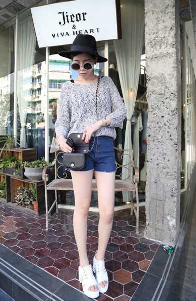 若隐若现的镂空针织衫十分性感,露出迷人的锁骨,展现了女性的优雅大方,搭配一条高腰的蓝色牛仔裤,显高之余还拉长了腿部的线条,搭配一双白色的厚跟鞋,十分独特,黑色的帽子展现出了韩系风的街头Feel。
