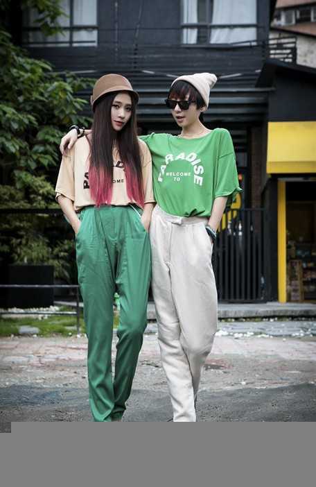 同款不同颜色的一款宽松的蝙蝠袖T恤,搭配一条宽松的哈伦裤子,街头风十足,展现了闺蜜之间的率真个性,搭配不同款式的帽子,使左图中的MM更加帅气大方,右图的MM更是帅气十足,绿色系的呼应,既不乏味也简单,秋天来了,还不赶紧和你的闺蜜们一起扫货?