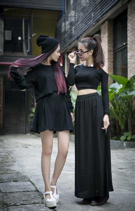 同色系的闺蜜套装搭配,虽然这两套搭配除了颜色一样之外没什么是相同的,但是这样的闺蜜装搭配也是挺有意思的哦,左图中的女生穿了一套宽松的两件套,袖子的镂空设计更是展现了女性的小性感,搭配一顶毛线帽子,这不就是秋天的节奏吗,右图中的MM穿了一件超级迷人的露肩短款紧身T,搭配一条黑色的长裙,时尚帅气,又不失高贵大方。这样的闺蜜装你喜欢不?