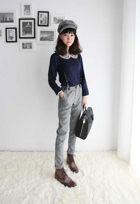 复古小男生气质的搭配似乎是我的最爱之一,薄款西装面料的背带裤非常适合初秋的气候,上衣的领口的格子拼接英伦风味浓郁,搭配上一双雕花皮靴和一个复古书包,充满了英伦复古味儿,帽子的搭配更是给人一种在英国卖报纸的小孩的感觉。