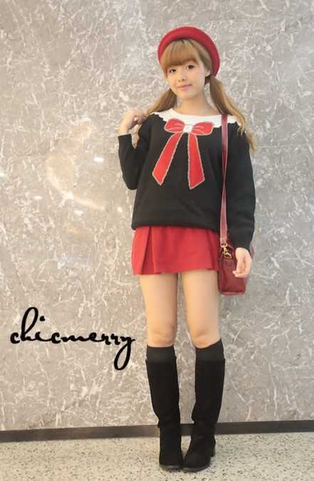 上衣领口位置的色彩拼接的地方都有珍珠做点缀,手工十分精致,很森系的一款娃娃针织衫,而且不分前后爱怎么穿都可以搭配一条红色的百褶短裙,甜美之余带着点小性感,搭配中筒的袜子,学院风顿现。