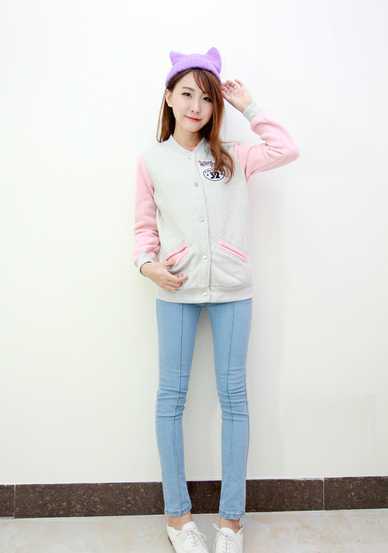 棒球服也是可以十分甜美可爱的哦,粉色的拼色袖子设计,展现了女孩甜美可爱的个性,搭配一条浅色的牛仔裤,简约时尚。英伦风的小白鞋更是让这身搭配的甜美风格更加浓郁,玫红色的毛线帽子势要把甜美风进行到底。