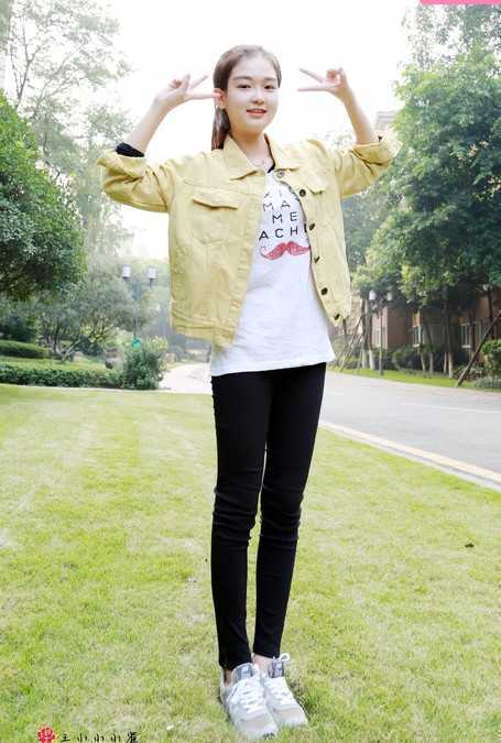 白色的字母T恤搭配一条黑色的紧身裤,简单时尚,外面搭配一件暗黄色的牛仔短款外套,既修身也休闲,加上一双运动鞋,让你尽显休闲时尚风格,高高扎起的马尾,更是展现了甜美乖巧的形象。