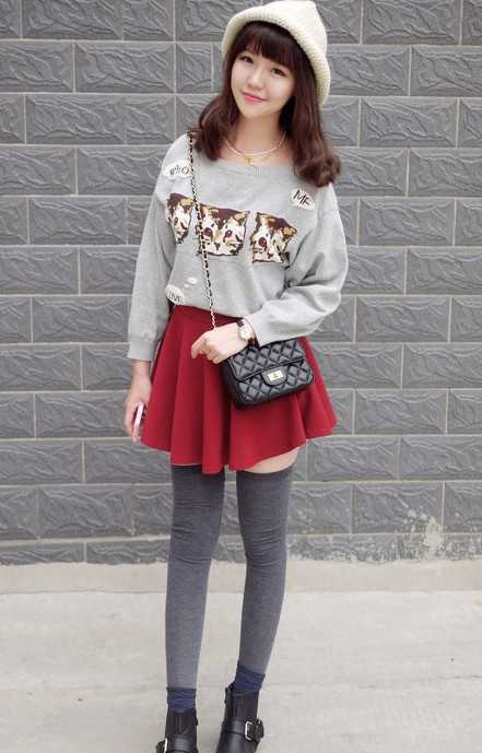 红色的百褶短裙,搭配一件超级萌的猫咪头像卫衣T恤,简单时尚又可爱,这样的搭配适合甜美系的MM哦,下身的高筒袜子搭配,不仅可以显腿长而且特别显瘦,搭配一双小短靴,超级时尚的哦。