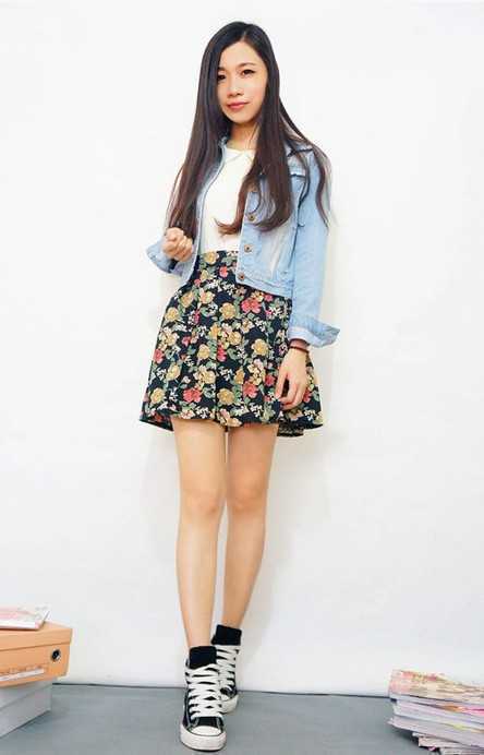 花色也是短裙中经典的一个款式哦,碎花的图案颇有田园的气息,搭配一件短款的浅色系牛仔外套,略微有点混搭的嘻哈感觉,搭配一双黑色中帮帆布鞋,展现了休闲街头的风格。