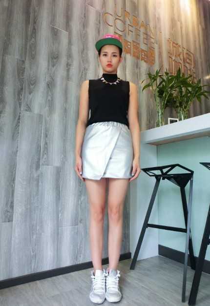 这款搭配是不是太空感超强的呢?短裙的斜边设计十分特别,使裙子变得立体,而且不累赘,搭配一件顶脖的无袖背心,简单大方,包臀的设计更能展现迷人的身材。