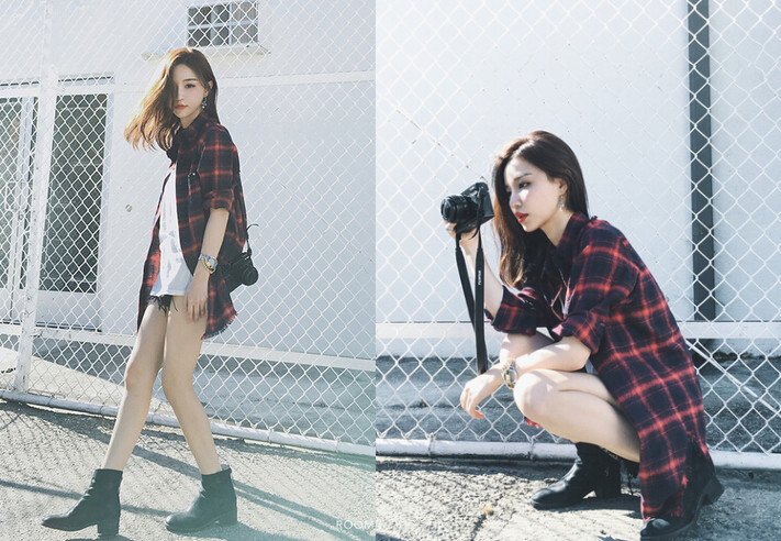 【2016年流行秋装搭配02】格子中长款的衬衫类型极具英伦风,一件简单的白色T桖打底,搭配上黑色流苏的高腰短裤以及黑色短靴,整体的细节搭配都给人一种非常经典耐看的感觉,随意又自在。