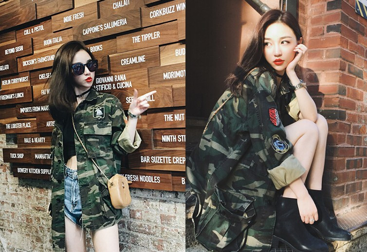 【2016年流行秋装搭配01】高品质的迷彩印花外套,版型规整有质感,酷炫又好看,而搭配着纯黑的短款背心及高腰牛仔裤就更显中性帅气的风格,再穿上一双黑色的短靴特别酷,整体的造型都十分地有个性。