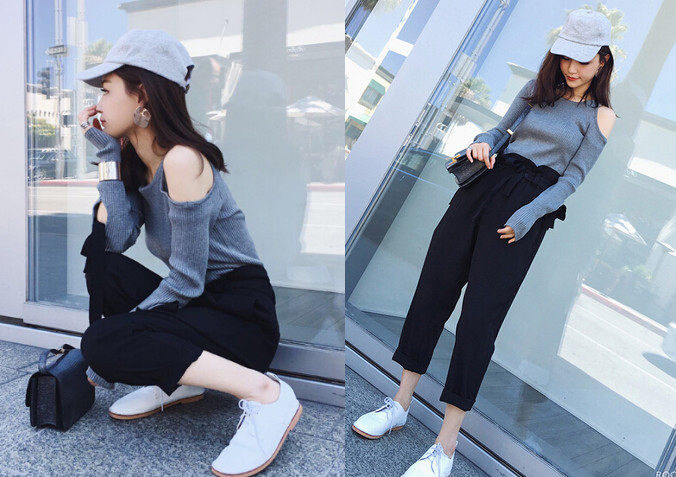 【2016年流行秋装搭配03】露肩的针织上衣绝对是今年秋季女装的流行款,搭配着高腰的花苞西装裤,整体给人的感觉都是十分地简约大方,显瘦的穿衣搭配既能甜美无敌又能性感优雅,一双小白鞋为整体造型完美加分。