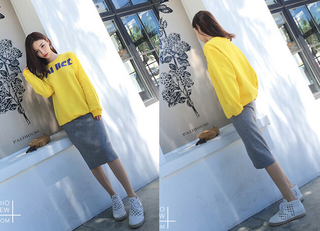 【2016年流行秋装搭配04】粉嫩的黄色毛衣款式宽松舒适,给人随性的时髦感,搭配着包臀半身针织裙混搭出新的风格感觉,还能使显高显瘦。白色的短靴和整体的搭配相互相成,十分地好看!