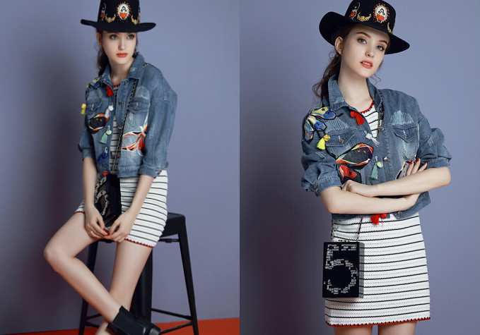 【2016年流行秋装搭配05】紧身的条纹背心内衬裙凸显了玲珑有致的好身材,一款印花短款的牛仔外套搭配起来极具欧美街头的大牌时尚范,再打上一款链条的斜挎包,简直就是出街凹造型的吸睛打扮!