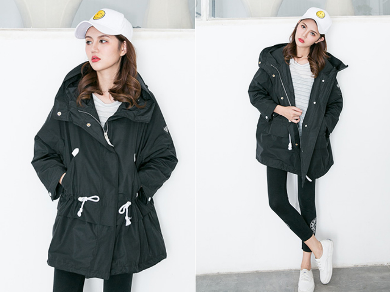 要想风衣穿出休闲感,不妨试试这件韩版修身风衣哦。抽绳的设计让你随时可以露出小细腰,A字型的下摆加上黑色的紧身裤,更加突出女生修长的双腿,白色的条纹T简约大方,作为内搭很是OK,加上白色的棒球帽和小白鞋,整个搭配又呈现出一些运动feel在里面。