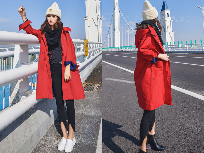 秋冬由于天气寒冷,常给人冷清肃穆的感觉,这时穿一些红色系的服饰不失为一个不错的选择。深蓝色的紧身T搭配黑色的紧身裤,外搭一件中国红色的韩版修身风衣,两者相互映衬,更加突出女生修长的身形,再套上一条同样深色系的围脖,既保暖又使整个造型的色彩更加和谐了。