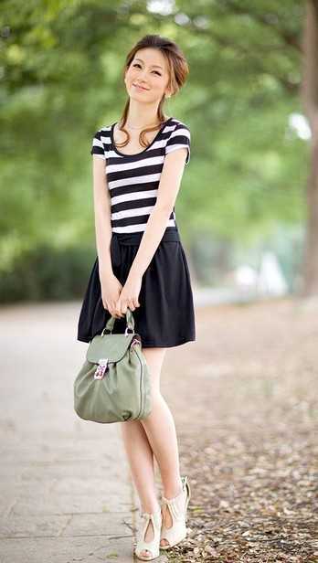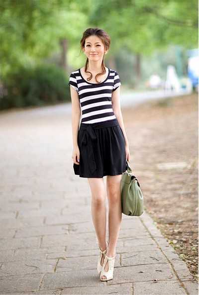 这样的条纹裙搭配,简约却不失时尚,大方又很质朴,是气质女生的首选哦,搭一小胯包,可以很大方的走上街头,很有自己的特别。很有自己的夏日风情。在时尚界里这样的搭配真的很不错哦,不妨一试这样的条纹裙搭配吧。