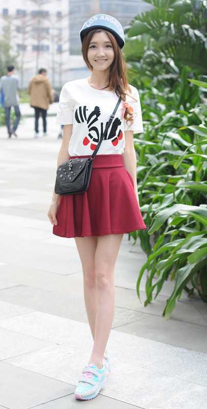 经典圆领短袖衫,小马印花图案很可爱,搭配复古红色短裙,完美秀出纤细美腿,搭配荧光色运动鞋,青春活力感尽展。