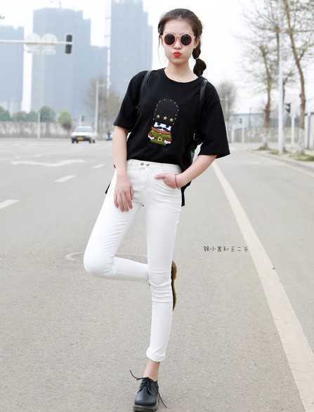 韩版百搭黑色短袖衫,搭配净白色小脚裤,展现出高挑好身材,搭配英伦风黑色鞋子,帅气简约风尽展。