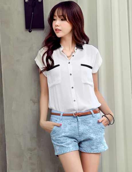 嫩蓝色夏季短裤,蕾丝拼接很仙美,搭配净白色休闲短袖衫,很舒适时尚,搭配白色春季单鞋,精致女人味尽展。