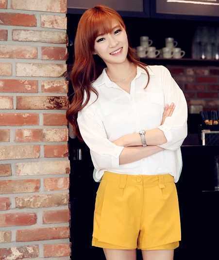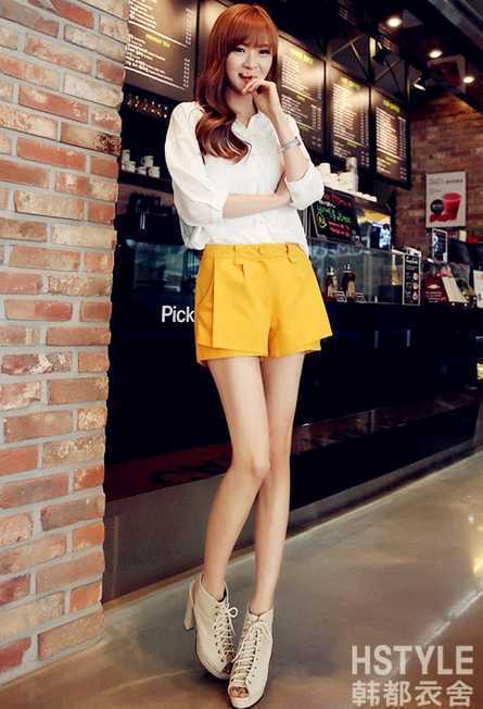 夏季休闲宽松短裤,不规则的设计,很时尚好看,搭配白色宽松衫,散发出一种清新迷人的气质,搭配卡其色高跟鞋,完美高挑身材尽展。
