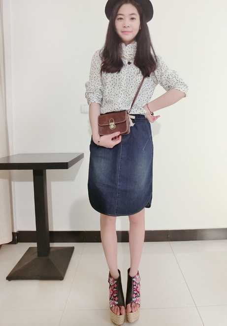 淑女款春季碎花衬衫,搭配高腰宽松牛仔半身裙,完美遮住肉PP显高挑,搭配高跟凉鞋,清爽舒适,随意斜跨棕色小包包,时尚复古。
