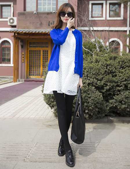 仙美欧根纱连衣裙,搭配大气高档蓝色针织开衫,清新又时尚,搭配显瘦黑色打底裤和黑色时尚鞋,打造出气质女神范。