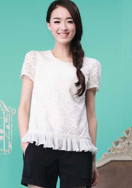 清新白色镂空短袖衫,百褶下摆很好看喔!